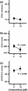 Trejo F, Nekrassov V, Sitges M (2001) Characterization of vinpocetine effects on DA and DOPAC release in striatal isolated nerve endings. Brain Res 909:59–67. doi:10.1016/S0006-8993(01)02621-X
