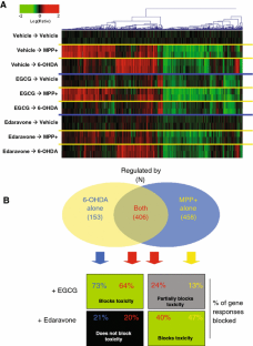 In Parkinson’s disease substantia nigra neurons degenerate likely due to oxidative damage interacting with genetic risk factors. Here, SH-SY5Y cells expressing wild-type or A53T α-synuclein had increased sensitivity to methyl-4-phenylpyridinium iodide (MPP+), which induces mitochondrial dysfunction, and 6-hydroxydopamine (6-OHDA), which causes oxidative stress. Edaravone protected only against MPP+, and EGCG ((−)-epigallocatechin-3-O-gallate) protected only against 6-OHDA. Thus genomic responses to MPP+ and 6-OHDA in the presence of these antioxidants were analyzed using microarrays. Pathway analysis indicated that MPP+ activated p53 (P < 0.001) while 6-OHDA induced the Nrf2 antioxidative stress response (P < 0.0001). EGCG was more effective at blocking 6-OHDA-mediated genomic responses, while edaravone was more effective against MPP+. We identified 32 genes that responded to both toxins except in the presence of an effective anti-oxidant; eight are transcription factors and potentially constitute a stress-response transcriptional network. These data provide insights into the mechanisms of neurotoxicity and identifies genes that might mediate antioxidant efficacy.