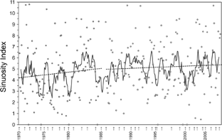 This paper introduces a new metric for tropical cyclone track shape within the tropical South Pacific (TSP) basin, based on measurements of track sinuosity. A sinuosity index (SI) is developed by applying a simple cube-root transformation to original track sinuosity values. Based on the resulting near-normal SI distribution, an ordinal four-category (quartile) naming system is then proposed for track-type classification. Track sinuosity patterns are also investigated over the last four decades (1970–2008). Analytical findings suggest that cyclone track sinuosity is an important parameter influencing the potential vulnerability of island archipelagoes to cyclone hazard. Principally, sinuously moving cyclones show some tendency for greater longevity and intensity than straighter-tracking storms and make up a larger proportion of systems forming in the western tropical South Pacific than those generated farther east. Although no long-term statistical trend can be established, track sinuosity is highly variable through time, implying that the TSP basin and the islands therein will continue to experience large but irregular inter-annual fluctuations in cyclone track morphology.