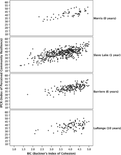 Disasters are unpredictable events that have catastrophic impacts. There is now a focus on disaster resilience and capacity building in the recovery of the community. Resilience literature also suggests a staged model of disaster impacts and likelihood of staged manifestations of resilience. It also points to a potentially important link between place-based social cohesion and resilience. This article reports on comparative findings of cohesion and resilience indices in four Canadian rural communities that experienced disasters and evacuation in potentially different phases of coping and resilience. Buckner’s Index of Cohesion and the Index of Perceived Community Resilience are examined in each community for relationships (correlation) between cohesion and resilience and for differences in the intensity of these variables. Our findings show a consistent significant positive correlation between cohesion and resilience, although the strength of the relationship varies. Findings also show place-specific differentiation in the mean intensity of both cohesion and resilience scores; temporal phases of disaster recovery for each community are also noted. This information can help in disaster recovery planning by ensuring supports are available at key points in time for communities that experience disasters. Other research is needed that compares communities that have experienced different types of disasters and over time periods to document any changes to resilience or cohesion thereby assisting with disaster policy development and programme planning.