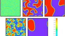 The numerical implementation used a finite-difference leapfrog method with temporal step δt = 0.005 and spatial step δx = 0.2. Periodic boundary conditions were adopted on a 10242 (2563) squared (cubic) lattice in 2d (3d). Near-racemic initial conditions were prepared in two steps. First, with \({\cal S} =\)1, the equation of motion for the net chirality \({\cal A}(t,x,y,z)\), Eq. 2, was solved with a simple quadratic potential, \(V({\cal A})=(1/2){\cal A}^2\) and low noise (a 2 = 0.1) until the volumed-averaged chirality (\({\cal A}(t) = (1/V)\int {\cal A}(t,x,y,z) dV\)) achieved a steady-state Gaussian distribution centered in the racemic state. By steady-state we mean that \(d \langle {\cal A} (t)\rangle /dt \approx 0\). Then, the noise (w(t,x,y,z)) was turned off and the potential was switched to that of Eq. 2. \({\cal A}(t,x,y,z)\) relaxed deterministically toward its dynamical equilibrium state, forming domains as illustrated in Fig. 2. Of all such configurations, only those allowing for domain coexistence with near-racemic values were selected, about 38% of our total sample. That is, we discarded all cases where \({\cal A}(t) \rightarrow \pm 1\) quickly, as these would not be sensitive to low noise environmental disturbances. The final 100 ensemble elements behaved typically as illustrated in Fig. 4: a coexisting domain structure was formed, achieving a near-static configuration for net chiralities not too far from the racemic state. At this point, the noise was turned on (at t > 600 in Fig. 4) in the equation for \({\cal A}(t,x,y)\), simulating the stochastic impact of environmental influences with different intensity and duration.