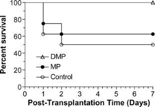 In IPRL studies, donor pretreatment with DMP, and to a lesser degree MP, significantly improved the uptake of hyaluronic acid (HA), a marker of endothelial cell function, following 8 h of cold preservation. However, neither pretreatment was protective after 24 h of preservation. In the OLT model using 24-h-preserved livers, the seven-day survival of untreated grafts was 50%. DMP pretreatment of donors significantly improved graft survival to 100%, whereas MP pretreatment was ineffective. Additionally, only DMP significantly increased the blood glucose concentrations and decreased the plasma concentrations of tumor necrosis factor-α after OLT. Other measured markers of liver injury were not affected by either pretreatment.