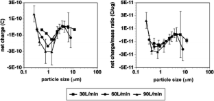 A 67.5:1 (%w/w) blend of 63–90 μm lactose with salbutamol sulphate, and lactose alone (with and without the blending process), was dispersed from a Cyclohaler™ into the electrical Next Generation Impactor at 30, 60 and 90 L/min. Mass and charge profiles were measured from each dispersion, as a function of impactor stage. The charge profile from an empty capsule in the Cyclohaler™ was also studied.