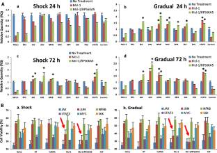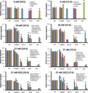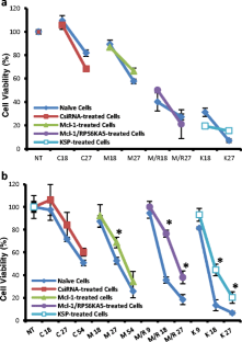 Two approaches to siRNA treatment were undertaken using lipid-modified polyethylenimines, a single high concentration (shock) and repeated increasing concentrations (gradual). The targets were Mcl-1, RPS6KA5 and KSP in MDA-MB-435 cells.