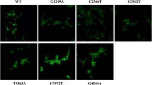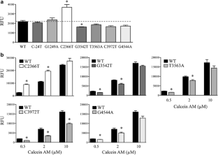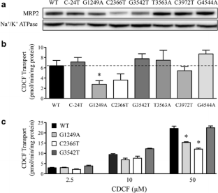 The cell surface expression of the C-24T-, G1249A-, G3542T-, T3563A-, C3972T- and G4544A-MRP2 variants was similar to WT-MRP2. While expression was similar, transport of calcein AM was enhanced in cells expressing the G3542T-, T3563A-, C3972T-, and G4544A-MRP2 variants. By comparison, cells expressing the C2366T-MRP2 variant had 40–50% lower surface expression, which increased the accumulation of calcein AM up to 3-fold. Accumulation of CDCF in inverted membrane vesicles expressing the C2366T-MRP2 variant was also reduced by 50%. In addition, the G1249A-MRP2 variant had decreased transport of CDCF.