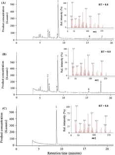 GC chromatograms of Ni-NTA affinity chromatography purified soluble fraction from induced cells transformed with empty pET41(b+) product from GPP. Peak (1) is linalool and asterisks represent peaks without hit in the National Institute of Standards and Technology (NIST) library. (PDF 36 kb)