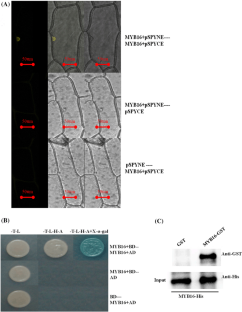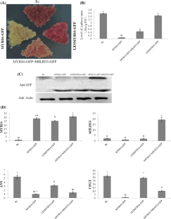 MdMYB16 forms homodimers and directly inhibits anthocyanin synthesis via its C-terminal EAR repressor. It weakened the inhibitory effect of MdMYB16 on anthocyanin synthesis when overexpressing MdbHLH33 in callus overexpressing MdMYB16. MdMYB16 could interact with MdbHLH33.
