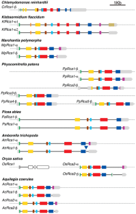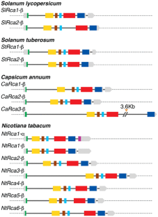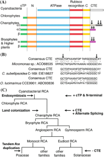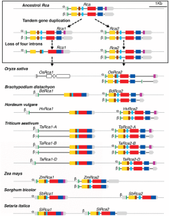 Rubisco activase is an essential enzyme for photosynthesis, which removes inhibitory sugar phosphates from the active sites of Rubisco, a process necessary for Rubisco activation and carbon fixation. The gene probably evolved in cyanobacteria as different species differ for its presence. However, the gene is present in all other plant species. At least a single gene copy was maintained throughout plant evolution; but various genome and gene duplication events, which occurred during plant evolution, increased its copy number in some species. The exons and exon–intron junctions of present day higher plant’s Rca, which is conserved in most species seem to have evolved in charophytes. A unique tandem duplication of Rca gene occurred in a common grass ancestor, and the two genes evolved differently for gene structure, sequence, and expression pattern. At the protein level, starting with a primitive form in cyanobacteria, RCA of chlorophytes evolved by integrating chloroplast transit peptide (cTP), and N-terminal domains to the ATPase, Rubisco recognition and C-terminal domains. The redox regulated C-terminal extension (CTE) and the associated alternate splicing mechanism, which splices the RCA-α and RCA-β isoforms were probably gained from another gene in charophytes, conserved in most species except the members of Solanaceae family.