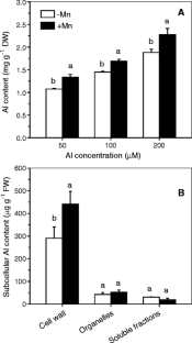 Aluminum (Al) and manganese (Mn) toxicity are two main constraints to crop production in some acid soils. In the present study, hydroponic experiments were conducted to investigate the phytoxicity caused by the metals Al and Mn in the Al-sensitive soybean (Glycine max) cultivar Jilin62. Results showed that more than 80% of the total cellular Al accumulated in the cell walls of the root tissue. Excessive Mn supply significantly increased the Al level in the root and aggravated Al toxicity, and as the result leading to a stronger inhibition of the root-elongation rate and root-biomass production. No obvious change of Al concentration was detected in root-cell organelles and soluble fractions. Interestingly, Al-induced increase in cell wall pectin content in the root was further enhanced by addition of Mn, which might explain how Mn aggravated Al toxicity. In addition, it was found that high levels of Al significantly alleviated Mn toxicity symptoms like brown spots on the old leaves, crinkle on the young leaves and shoot growth inhibition. This Al reduced Mn toxicity was related to the decrease of Mn content in shoots under combined Al and Mn stress. Lanthanum (La3+), which has similar chemical properties as Al, can also reduce Mn toxicity and Mn accumulation in the plant. Thus, it is speculated that Al exerts an antagonistic effect on Mn uptake, and thus leads to alleviated Mn toxicity.