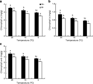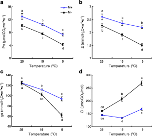 The effect of arbuscular mycorrhizal (AM) fungus, Glomus etunicatum, on growth, water status, chlorophyll concentration and photosynthesis in maize (Zea mays L.) plants was investigated in pot culture under low temperature stress. The maize plants were placed in a sand and soil mixture at 25°C for 7 weeks, and then subjected to 5°C, 15°C and 25°C for 1 week. Low temperature stress decreased AM root colonization. AM symbiosis stimulated plant growth and had higher root dry weight at all temperature treatments. Mycorrhizal plants had better water status than corresponding non-mycorrhizal plants, and significant differences were found in water conservation (WC) and water use efficiency (WUE) regardless of temperature treatments. AM colonization increased the concentrations of chlorophyll a, chlorophyll b and chlorophyll a + b. The maximal fluorescence (Fm), maximum quantum efficiency of PSII primary photochemistry (Fv/Fm) and potential photochemical efficiency (Fv/Fo) were higher, but primary fluorescence (Fo) was lower in AM plants compared with non-AM plants. AM inoculation notably increased net photosynthetic rate (Pn) and transpiration rate (E) of maize plants. Mycorrhizal plants had higher stomatal conductance (gs) than non-mycorrhizal plants with significant difference only at 5°C. Intercellular CO2 concentration (Ci) was lower in mycorrhizal than that in non-mycorrhizal plants, especially under low temperature stress. The results indicated that AM symbiosis protect maize plants against low temperature stress through improving the water status and photosynthetic capacity.