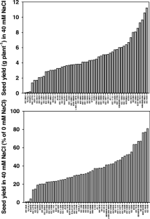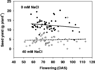 When grown in soil with 40 mM NaCl, a 27-fold range in seed yield was observed among the 55 chickpea genotypes. The increased salt tolerance, as measured by yield under salinity or relative yield under saline conditions, was positively associated with higher pod and seed numbers, and higher shoot biomass, but not with time to 50 % flowering nor with the number of filled pods in the non-saline treatment. Pod abortion was higher in the salt sensitive genotypes, but pollen viability, in vitro pollen germination and in vivo pollen tube growth were not affected by salinity in either the salt tolerant or salt sensitive genotypes. The concentrations of sodium and potassium ions, but not chloride, in the seed were significantly higher in the sensitive (106 μmol g−1 DM of sodium and 364 μmol g−1 DM of potassium) than in the tolerant (74 and 303 μmol g−1 DM, respectively) genotypes. Sodium and potassium, but particularly chloride, ions accumulated in leaves and in pod wall, whereas accumulation in the seed was much lower.