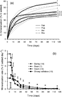Roots from 20 different crops and 4 botanical families, collected under field conditions were incubated in soil for 120 days at 25 °C. The initial chemical composition of roots was determined. The C mineralization was assessed by the continuous measurement of CO2 release and using single exponential model. PCA analysis was used to explore qualitative pattern in root quality and decomposition.