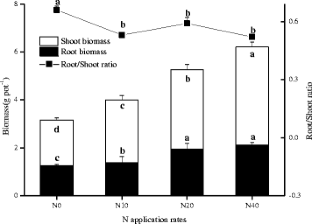 Rice (Oryza sativa L.) was continuously supplied with 14C-labeled CO2 (14C-CO2) for 36 days, with increasing N fertilizer rates (0 [N0], 10 [N10], 20 [N20], or 40 mg N kg−1 soil [N40], respectively).