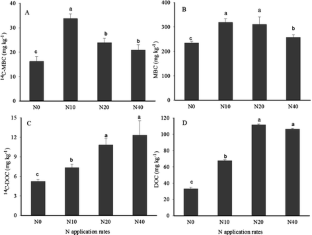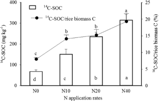 Nitrogen fertilization promotes deposition of photosynthesis-derived C into SOC pools in a rate-dependent manner. However, the 14C-MBC as a proportion of both 14C-SOC (14C-MBC/14C-SOC) and MBC (14C-MBC/MBC) increase during rice growth at lower N concentrations.