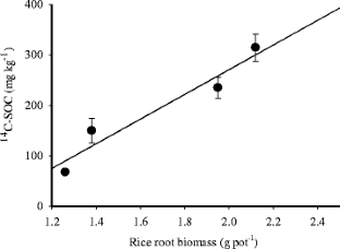 Rice shoot and root biomass significantly increased following N fertilization. The amount of photosynthesis-derived C converted into soil organic carbon (14C-SOC) was proportional to the soil N concentration, and accounted for 8.0–19.3 % of rice biomass C. The 14C-SOC content was positively correlated with the rice root biomass, suggesting that N increased root exudation of photosynthesis-derived C. The amounts of 14C-labeled C in the dissolved organic carbon (14C-DOC) and in the microbial biomass carbon (14C-MBC), as proportions of 14C-SOC, were 3.9–7.8 and 6.6–24.0 %, respectively. The 14C-DOC, 14C-MBC, and 14C-SOC as proportions of total DOC, MBC, and SOC were 9.7–11.6, 6.9–10.6, and 0.37–1.71 %, respectively.