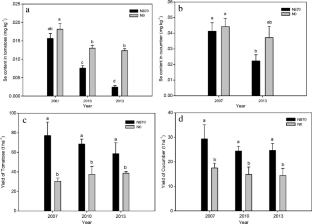 Vegetables were continuously cultivated for 6 years in a microplot field experiment and treated annually with conventional N fertilizer (870 kg ha−1 inorganic fertilizer) and 0 kg N ha−1 as control treatment in polytunnel greenhouse vegetable system in the Taihu Lake region of China. Both treatments included 234 kg ha−1 N provided by manure. After each harvest, soil and vegetable samples were collected, and analyzed for soil NO3-N, Olsen-P, Se, phosphate extractable S and Se and vegetable Se.
