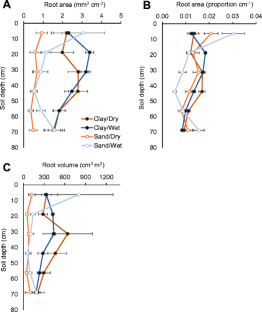 Across the four sites, a change from sand to clay soils had a greater effect on fine-root abundance and distributions than a 50% increase in precipitation from dry to wet sites. Results highlight the importance of soil properties on root dynamics and carbon pools in the region.