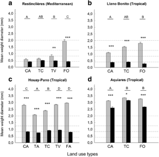 Soil aggregate stability, soil physicochemical properties and fine root traits were measured along land use gradients (from monocultures to agroforestry systems and forests), at two soil depths at four sites (Mediterranean and tropical climates) with contrasting soils (Andosol, Ferralsol, Leptosol and Fluvisol).