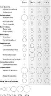 Biocrust richness and diversity increased with increasing stage, and there were marked differences in the microbial signatures among stages. Bare and Late stages were dominated by Alphaproteobacteria, but Cyanobacteria was the dominant phylum in Early and Mid stages. The greatest differences in microbial taxa were between Bare and Late stages. Network analysis indicated highly-connected hubs indicative of small networks.