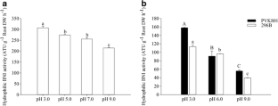 Sorghum plants were grown in a hydroponic system with pH of nutrient solutions ranging from 3.0 ̴ 9.0. Pharmacological agents [(fusicoccin and vanadate) and anion-channel blockers (−niflumic acid (NIF) and anthracene-9-carboxylate (A9C)] were applied to root exudate collection solutions; BNI activity was determined with luminescent Nitrosomonas europaea bioassay. Sorgoleone levels in root exudates and H+ excretion from roots were determined. Two-phase partitioning system is used to isolate root plasma membrane (PM) and H+ ATPase activity was determined.