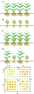 Zea mays and Glycine max were planted under three cropping regimes, i.e., monocropping or intercropping the two species in the same hole (sowing at the same point) or separated at a certain distance. After 50 days, an in situ 15N-labeling experiment was carried out to assess N uptake preference (NO3− or NH4+).