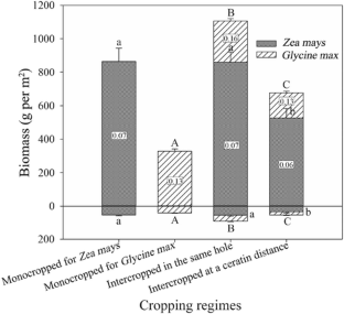Intercropping in the same hole increased plant density and total biomass. Both species showed a strong preference for NO3− over NH4+. Intercropping in the same hole increased and decreased NO3− uptake by Z. mays and G. max, respectively. Z. mays significantly increased NH4+ uptake when intercropped in the same hole or at a certain distance.