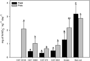 We very much appreciate the financial support of the project “Climate-smart crop-livestock systems for smallholders in the tropics: Integration of new forage hybrids to intensify agriculture and to mitigate climate change through regulation of nitrification in soil” by the Federal Ministry for Economic Cooperation and Development (BMZ, Germany). This study was undertaken as part of the LivestockPlus project funded by CGIAR Research Program (CRP) on Climate Change, Agriculture and Food Security (CCAFS), which is a strategic partnership of CGIAR and Future Earth. In addition, this work was, in part, conducted as part of the Livestock CRP. We thank all donors that globally support the work of the program through their contributions to the CGIAR system. We would like to thank Lucia Chavez, Maria Eugenia Recio, Aracelly Vidal and Edwin Palma for their technical assistance in performing this research. We thank the two anonymous reviewers for their valuable and constructive comments.
