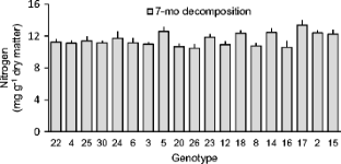 We used 19 Betula pendula genotypes randomly selected from a local population in south-eastern Finland to establish a long-term, 35-month litter decomposition trial on forest ground. We analysed the effect of litter quality (N, phenolics and triterpenoids) of senescent leaves and decomposed litter on microbial abundance and litter mass loss.