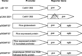 We thank USDA-GRIN for providing the seeds of rice, barley, maize, Sorghum, rye, and oats. This work was supported by the National Research Initiative of the USDA Cooperative State Research, Education and Extension Service, grant number 2007-35301-18036. We thank the Michigan Technological University’s Biotech Research Centre (BRC) for their continuous support and funding. We personally thank Lorie Bernhardt (Dale Bumpers National Rice Research Center) for providing bulk quantities of rice seeds. We thank Dr. Chandrashekhar P. Joshi (Michigan Technological University) for the plasmid pBI121 and Dr. Victor Busov for Agrobacterium (GV3101). We also thank the Institute of Plant Systems Biology, Ghent University, Belgium, for pBGWFS7 and CAMBIA, Australia, for pCAMBIA2201.
