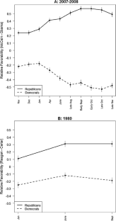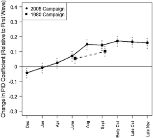 One potential concern is that the models testing activation should include ideological proximity to the candidates rather than ideological position. Because the APYN Panel includes questions about where respondents think the candidates stand on the ideology scale in two waves only (neither of which is the initial wave), the proximity measure cannot be appropriately constructed for the models appearing in Fig. 4. However, the APYN Panel includes a battery of questions in the seventh (early September), ninth (late October), and final (late November) waves asking respondents about their own positions and their perceptions of the candidates’ positions. A truncated activation model using these late interviews yields the same results whether issue positions or issue proximity is included.