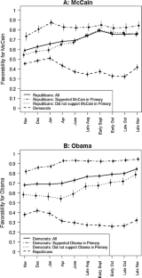 Another concern with panel data is that participation in the panel makes respondents different from individuals who are not part of the study. For example, panelists may learn from their experience in the panel, or perhaps pay more attention to the campaign as a result of participation. Such learning could artificially activate predispositions. The APYN Panel includes additional fresh cross sectional samples in the third, sixth, and ninth interview waves. These cross-section samples can be compared to the panel sample to identify any difference in their opinions or the correlations between those opinions and candidate evaluations (without the inclusion of respondent fixed effects because the fresh cross section samples do not have multiple observations of the same individuals). The results from these tests appear in appendix table A2. Members of the fresh sample are less favorable toward McCain relative to Obama than the panelists in the third and ninth waves, but not in the sixth. Otherwise there are no statistically significant differences between the groups in their party identification, opinions of President Bush, and ideology. Additionally, there are no statistically significant differences in the correlations between these opinions and their evaluations of the candidates when comparing panelists and the fresh samples.