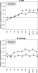 The fixed effects control for all time-constant unobserved or observed variables but not for any effects produced by changes in the salience of those variables. Therefore, the activation of party identification in Fig. 2 could actually be the activation of any time-constant excluded variable positively correlated with party identification. To protect against such a misinterpretation, I estimate an activation model that also includes time interactions with a variety of observed time-constant variables including race, ethnicity, gender, education, and income. Although these models cannot control for the activation of unobserved variables, the fact that the results in Fig. 2 do not change with the inclusion of these additional interactions is reassuring.