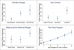 All calculations of predicted probabilities are done using margins in Stata 14, following the observed-value approach (Hanmer and Kalkan 2013); after setting a few variables of interest to specific representative values, adjusted predictions are calculated using the observed values for each observation in the entire subpopulation of donors in the sample and then the average predicted probabilities for the donor population in the sample are calculated and reported rather than the probabilities for a hypothetical average donor within the sample.