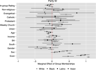 It is possible to back out these indirect effects in a variety of ways. One way would be to use a series of equations as part of a structural equation framework. Another way would be to estimate a model that withheld policy orientations and partisanship variables and then compare the biased coefficients to the coefficients in Fig. 4. The difference between the biased and correct coefficients is the indirect effect of group memberships on vote choice that travels through partisanship and policy orientations.