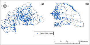 For confidentiality purposes, DHS randomly displaces rural cluster centroids between 0 and 5 km and an additional random selection of 10 % of the cluster points between 0 and 10 km, resulting in a relatively small average displacement distance of 2.45 km (Burgert et al. 2013). The random displacement algorithm ensures that centroids fall within the correct first-level administrative unit (Burgert et al. 2013). Although we aggregate points to the second-level administrative unit, the introduced uncertainty is likely minimal due to the large size of provinces/departments (most clusters are more than 5 km away from the borders). In addition, the random nature of the displacement ensures that the resulting estimates are not systematically biased.