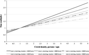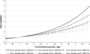 Crowding in PT systems can be estimated according to different metrics. Load factors correspond to the ratio between the number of users in the trains and the number of seats proposed. Because this measure does not consider the varying in-vehicle design of the rolling-stock, passenger density is generally preferred. This will be our measure of crowding in this article. Note also that, in Japan, crowding is measured through the “Japan Industrial Standard” that merges together the seat and the standing capacities of the vehicles see Kato (2014).