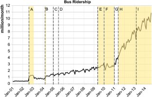 Since 2001, the Taichung City Government has launched several policies to stimulate public transit ridership. Based on this successful experience of reforming the urban bus system, the aims of this study are to analyze the structural change in bus ridership time series over a period of more than a decade. The major objectives are to determine effective policies and explore critical factors. According to monthly ridership from 2001 to 2014, five regimes of bus ridership and three effective bus policies were defined. Important elements of successful policies include complete bus network, high frequency of buses and mileage subsidy. These policies have brought high growth to once very low bus ridership in Taichung City. This type of research process helped to provide an understanding of actual outcomes of past policies, as well as to obtain key factors, which can be used to continue to formulate or adjust public transportation policies. The results of this study may serve not only as a reference for formulating bus strategy in Taichung City, but also for providing direction in the development of public bus service in similar-sized cities.
