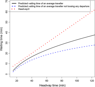 Let headway, HE\(= \frac{O}{F}\) where O are opening hours and F frequency. Using the power relationship between waiting time (WT) and headway in formula (1) it can be deduced that \(\frac{dWT}{dF } \ < {0\; {\text{and}}\; \frac{{d^{2} WT}}{{dF^{2} }}} \ > 0\). Hence, WT deceases convexly with F meaning that the marginal effect of F on WT diminishes. The same is true for hidden waiting time (HT). The above implies that the marginal benefits for the users of increasing frequency decline.