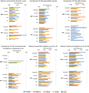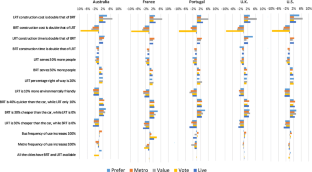 Interest in modal preferences remains a topic of high interest as governments make infrastructure decisions that often favour one mode over the other. An informative input into the infrastructure selection process should be the preferences of residents, since they can guide buy into support political and bureaucratic choice making. Cost–benefit analysis (CBA) uses the self-interest preferences of individuals as the relevant interpretation of ‘individual preferences count’, which in aggregate represent the benefit to society of candidate investments. However, the CBA benefit calculations can be rather restrictive with other preference metrics often being identified and used in various ways to inform the debate on infrastructure support. In this paper we assess how the preferences for bus rapid transit (BRT) and light rail transit (LRT) change with different roles the residents may play: a citizen or altruistic resident, a self-interested resident, a tax-payer, and as a voter. We use data collected in five countries to investigate preference differences and also to establish whether there is replicability of the findings across geographical jurisdictions. The findings suggest that there are, in general, noticeable differences in preference revelation across the metrics; however there are also both similarities and differences in the role of specific attribute drivers (as represented by willingness to pay, and magnitude of support for a specific mode) within and between preference metrics across countries.