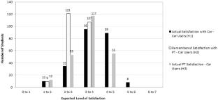 Car Satisfaction and Remembered PT Satisfaction values correspond to those predicted using the models of H1 and H2, respectively. Observed values may also be utilized instead for the purpose of comparison, yet, predicted values are used for the sake of consistency because the actual PT Satisfaction of car users (if they were to use PT regularly) can only be obtained through applying the model corresponding to H3.
