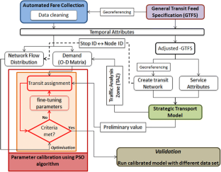 This paper describes a practical automated procedure to calibrate and validate a transit assignment model. An optimization method based on particle swarm algorithm is adopted to minimize a defined error term. This error term which is based on the percentage of root mean square error and the mean absolute percent error encompasses deviation of model outputs from observations considering both segment level as well as the mode level and can be applied to a large scale network. This study is based on the frequency-based assignment model using the concept of optimal strategy while any transit assignment model can be used in the proposed methodological framework. Lastly, the model is validated using another weekday data. The proposed methodology uses automatic fare collection (AFC) data to estimate the origin–destination matrix. This study combines data from three sources: the general transit feed specification, AFC, and a strategic transport model from a large-scale multimodal public transport network. The South-East Queensland (SEQ) network in Australia is used as a case study. The AFC system in SEQ has voluminous and high quality data on passenger boardings and alightings across bus, rail and ferry modes. The results indicate that the proposed procedure can successfully develop a multi-modal transit assignment model at a large scale. Higher dispersions are seen for the bus mode, in contrast to rail and ferry modes. Furthermore, a comparison is made between the strategies used by passengers and the generated strategies by the model between each origin and destination to get more insights about the detailed behaviour of the model. Overall, the analysis indicates that the AFC data is a valuable and rich source in calibrating and validating a transit assignment model.