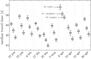 where \(TT^{75}\) is the 75th percentile of the travel times distribution from one simulation. The subscript ref refers to the reference scenario before gates where installed and the subscript \(L'\) refers to the travel times through the intersection \(L'\). This definition gives emphasis on improving the travel time through the intersection without neglecting the system as a whole.