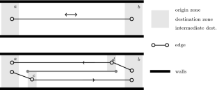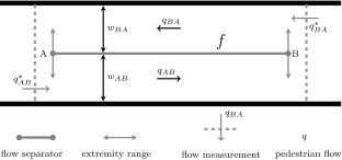 Demand The demand is composed of pedestrian flows with specific origins and destinations. Each individual \(n\in N\) has a free-flow walking speed \(v_n\) sampled from a normal distribution with a mean of 1.34 m/s (Weidmann 1993). Their origin and destination are sampled inside zones representing the entrance and exit points from the infrastructure (zones a, b, c and d from Fig. 16). The infrastructure used for the case study does not contain multiple paths to the pedestrian’s destinations, therefore route choice is reduced to route following. For a given origin and destination, only one single route exists.