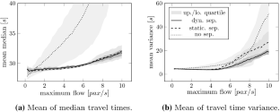 For each replication of the simulation, the median travel time of all pedestrians is computed. We then visualize the distribution of these medians by using a box plot. The results for the reference scenario without gates and the case with gates are presented in Fig. 20. It is apparent that the median travel times do not change significantly between both scenarios. Gating slightly decreases the mean of the median travel times. The median of median travel times increases when gating is used. Although the travel times are not significantly improved, a positive effect on travel time variance is observed. This is visible through the reduction in variance in the box plots. Without gating the interquartile range is 2.6 s, which is then reduced to 2.06 s when gating is used.