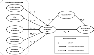 Achieving a critical mass in the acceptance of fully autonomous public transport (APT) is crucial for a society to effectively realise APT’s intended environmental, social and economic benefits. The current study analyses the determinants contributing to user acceptance of APT through three theoretical lenses, namely, Unified Theory of Acceptance and Use of Technology (UTAUT), Perceived Value Theory and Social Exchange Theory. Survey data were collected from 476 commuters in Beijing, China. The results reveal that the five dimensions of UTAUT (i.e. performance expectancy, effort expectancy, social influence, facilitating conditions and hedonic motivation) have positive influence on users’ value perception of APT. Consequently, users’ value perception of APT exerts both direct and indirect influences on users’ acceptance of APT via trust. A key contribution of this study is the combination and synthesis of several complementary behavioural theories to explain user acceptance of autonomous vehicles. In addition, the results offer important implications for transport policymakers and operators, in particular, pertaining to areas on resource allocation, marketing, communication and education to improve user acceptance of APT.