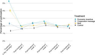 We also found that the percentage of users who uninstalled the app during the campaign was small and very similar across conditions: economic incentive (0.58%), cooperation message (0.54%), both (0.47%), and control (0.57%).