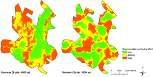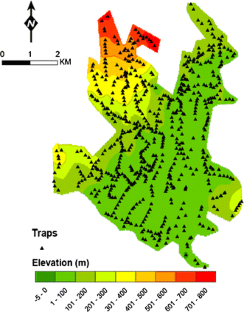 Area-wide integrated pest management requires an understanding of insect population dynamics and definition of suitable techniques to quantify spatio-temporal variability to make better pest management decisions. However, the viability of area-wide integrated pest management has often been questioned because of the high monitoring costs. The present study aimed to: (i) analyse the spatial and temporal dynamics of the olive fruit fly over a large olive growing area (Ormylia, Greece), and (ii) define a methodology to determine monitoring zones to optimize the monitoring effort over space and time in area-wide integrated pest management programmes. Data from an olive fruit fly monitoring network based on McPhail traps were utilized. The multi-variate spatial (elevation) and temporal (6 periods) data of olive fruit fly population density were analysed by principal component analysis, co-kriging and factor kriging to produce thematic maps and to delineate monitoring zones. Olive fruit fly density was spatially correlated from 200 to 4 000 m. The spatial pattern changed over the monitoring season. Areas with high density of olive fruit flies shifted from high altitudes in summer to lower altitudes towards autumn. Three recommended levels of monitoring intensity were defined, thus delineating homogeneous monitoring zones for summer (July to September) and October. It was concluded that delineating monitoring zones through multi-variate geostatistics is a suitable approach for optimising the monitoring effort, because population density distribution is spatially structured over large areas and changes over time.