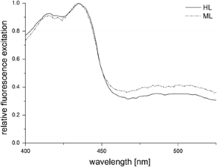 In the present study, the high light (HL) acclimation of Chromera velia (Chromerida) was studied. HL-grown cells exhibited an increased cell volume and dry weight compared to cells grown at medium light (ML). The chlorophyll (Chl) a-specific absorption spectra (\(a_{\text{phy}}^{*}\)) of the HL cells showed an increased absorption efficiency over a wavelength range from 400 to 750 nm, possibly due to differences in the packaging of Chl a molecules. In HL cells, the size of the violaxanthin (V) cycle pigment pool was strongly increased. Despite a higher concentration of de-epoxidized V cycle pigments, non-photochemical quenching (NPQ) of the HL cells was slightly reduced compared to ML cells. The analysis of NPQ recovery during low light (LL) after a short illumination with excess light showed a fast NPQ relaxation and zeaxanthin epoxidation. Purification of the pigment–protein complexes demonstrated that the HL-synthesized V was associated with the chromera light-harvesting complex (CLH). However, the difference absorption spectrum of HL minus ML CLH, together with the 77 K fluorescence excitation spectra, suggested that the additional V was not protein bound but localized in a lipid phase associated with the CLH. The polypeptide analysis of the pigment–protein complexes showed that one out of three known LHCr proteins was associated in higher concentration with photosystem I in the HL cells, whereas in ML cells, it was enriched in the CLH fraction. In conclusion, the acclimation of C. velia to HL illumination shows features that are comparable to those of diatoms, while other characteristics more closely resemble those of higher plants and green algae.