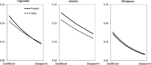 Logistic regression results of moderation by gender of peer attitudes variable on cigarette, alcohol, and marijuana use (n = 17,865). Confidence intervals (95 %) are reported in parentheses (DOCX 14 kb)