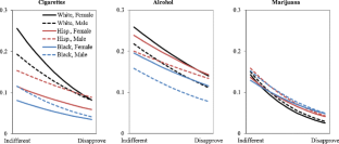 Logistic regression results of moderation by race and gender of peer attitudes variable on cigarette, alcohol, and marijuana use (n = 17,865). Confidence intervals (95 %) are reported in parentheses (DOCX 55 kb)